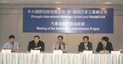 2007年8月6日下午,在香港太古广场5楼会议厅,中大国际控股有限公司与越南汽车工业总公司就双方合资合作的相关事宜广泛交换了意见。中大国际控股有限公司董事局主席徐连国、董事局副主席张玉清及越南汽车工业总公司董事长阮文科等出席会议,并就合资合作的若干问题达成了一致意见。