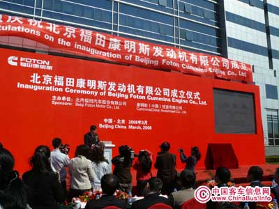 2008年3月26日,北汽福田汽车股份有限公司(简称福田汽车)旗下的第一家中外合资企业——北京福田康明斯发动机有限公司(简称BFCEC)正式成立,并在北京昌平的福田汽车总部举行了隆重的成立仪式。这一发动机合资公司建成以后年生产能力将达40万辆,是我国目前最大的发动机生产企业。