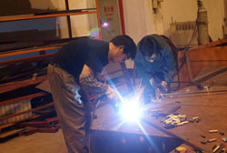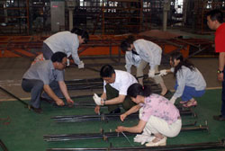 5月21日晚,记者在东风旅行车公司见到,整个焊装车间灯火通明,焊花飞溅,电弧闪明,一片繁忙的景象,近50余名工人在阵阵刺耳轰鸣声中切割钢管、焊接支架。他们正在紧张的为四川汶川地震灾区人民赶制帐篷支架。