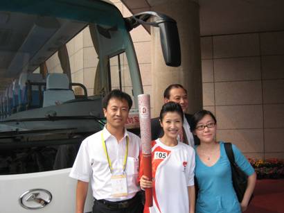 在圣火传递中,最富亲情的当属第105棒火炬手春妮的夫妻配,春妮是北京电视台的主持人,她和丈夫蒋虎分享了当天的传递路程,夫妻俩人联手高举 “ 祥云 ” ,面带笑意,将幸福和温馨的情感传递给在场的每一个人。为了纪念这一人生的特别时刻,专门为火炬手服务的一位海格客车司机杨洪在征得春妮同意后,有幸在自己的大巴前同她合影。