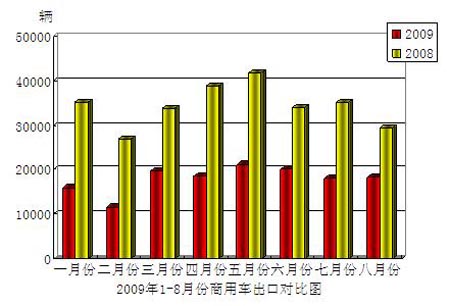 2009年8月份,商用车出口1.84万辆,比上月增长了2.26%,比去年同期下降了37.85%;创汇金额3.51亿美元,比去年同期下降了49.76%。其中:货车产品出口1.51万辆,比上月增长了4.80%, 比去年同期下降了28.33%;创汇金额2.02亿美元,比去年同期下降了40.76%。
