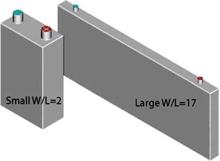 长方形蓄电池一般是叠压型,圆柱形蓄电池是卷绕型。它们的封装方式各不一样,热特性由于结构不同存在相应差异。不同大小形状的圆柱与长方形蓄电池的热分布是不相同的。由于散热表面积大小不同,蓄电池内部的热梯度也不同。图2的长方形蓄电池W/L大亦即有较大的散热表面积,内部的温差较小,散热性能较好。