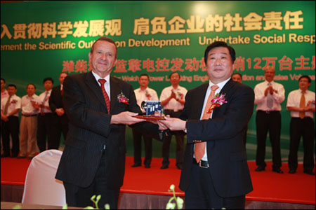 7月9日,第一个开发出拥有完全自主知识产权国Ⅲ发动机的潍柴动力,在北京举行蓝擎电控国Ⅲ发动机产销12万台主题庆祝活动,并与国际著名的高压共轨系统供应商——德国博世公司在北京签署协议,双方将在前期紧密合作的基础上,建立更加稳固的长期战略合作关系,此举将进一步促进双方合作的纵深发展,大大提升双方在各自领域的竞争力。与潍柴同时签署协议的,还有著名汽车零部件供应商博格瓦纳公司。此时,距离全国实行第三阶段排放标准刚好过去了一年时间。在一年的时间里,潍柴动力蓝擎电控发动机凭借优异的性能、可靠的质量以及完善的社会服务,赢来了订单持续上升的局面。