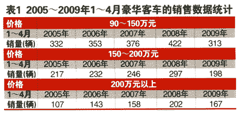 2009年1—4月90万元以上高端客车市场出现了一定的负增长态势,但比1—3月的减幅有所放缓,而该细分市场需求的数量与其它价格区间比仍然相当有限。其原因分析如下: