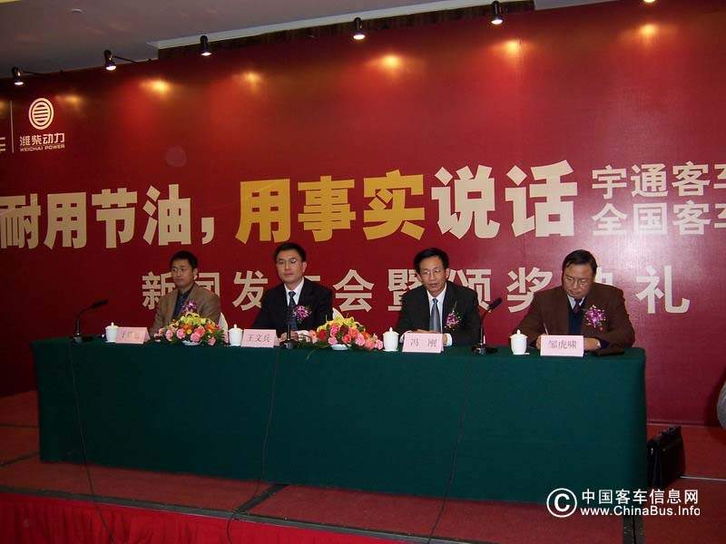 12月4日,宇通“耐用节油 用事实说话”新闻发布会在北京召开,会上,宇通正式发表了《宇通耐用节能宣言》,号召全行业行动起来,为实现节约型发展而努力。同时 “宇通客车·潍柴动力客车节油巡回赛”的最后一站北京站的颁奖典礼在发布会后隆重举行。