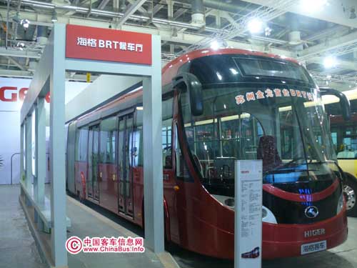 海格大容量BRT,采用“子弹头”式动感流线型设计,车身颜色采用了时尚“酒红色”,载客总数达到165人,最高车速达每小时80公里,整车采用低地板底盘设计,同时悬挂系统采用ECAS控制系统,车身在停靠站台时可以自动降低高度和侧倾,提高了乘客上下车的效率和便利性。