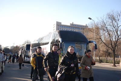 大约又过了半个小时,吉林歌舞剧院的演员相继下车进入中央电视台。我登上了第一辆A90,车内真是温暖如春,与外面的寒冷形成鲜明对比,真有些后悔为什么没有第一时间冲上来。