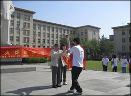 起跑传递活动仪式开始,由南开大学教师、学生组成的老中青三代南开人表演了饱含深情的大型诗朗诵《九十年风雨兼程》,展现了新一代南开人传承南开薪火的决心与愿望。经过一系列节目,火种护卫手高擎火炬,自省身楼前出发,在师生的热烈掌声和热情的期盼中,将火炬交给年逾八旬的环境科学家、南开大学戴树桂教授。随后,戴树桂教授将火炬交给第一棒火炬手、商学院2006级本科生梁飞,火炬传递由此开始。