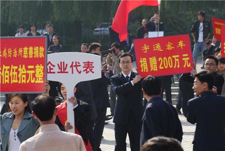10月16日,2009郑州慈善日活动在绿城广场举行,继去年捐款100万元后,宇通客车慷慨解囊,再次捐出200万元,成为当天捐款金额最多的企业,用实际行动担负企业公民的社会责任,推动和谐社会建设。