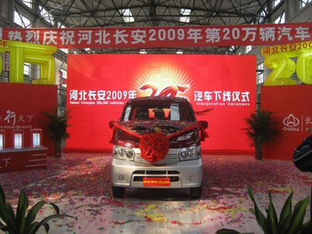 10月24日,河北长安公司总装车间生产线上,一辆崭新的新经济商用车——星光4500缓缓驶下生产线,这是该公司2009年第20万辆汽车,这标志着河北长安自2005年实现年产10万辆后,经过短短4年时间的快速发展后,所实现的又一次历史性跨越。