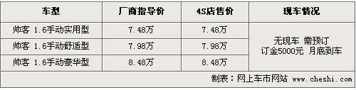 据4S店销售人员介绍,目前帅客只有展车和试驾车为消费者提供,现车需要预付订金预订,订金5000元,11月底首批现车将会抵京。同时店内开展免费试用活动,用户可将该车作为私人用车免费使用3天。整个活动将持续到12月下旬,具体活动消费者可以致电咨询详情。