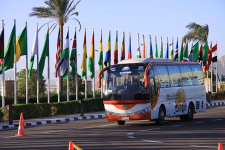 近日,“中非合作论坛第四届部长级会议”在埃及红海之滨沙姆沙伊赫顺利闭幕。在非洲市场享有盛誉的宇通客车,继服务08年北京奥运会及09年国庆60周年阅兵典礼后,又为本次中非合作论坛这项国际级官方会议,提供54辆豪华旅游客车作为会务用车,接送多国参会代表。美丽的红海之滨,见证中非友好的车队一路畅行,而早在4年前,非洲大地上就已出现了宇通客车的身影。如果旅游前往埃及,不管是在开罗还是在红海之滨沙姆沙伊赫,都有外观新颖靓丽的宇通客车迎接全球的游客。而在加勒比海畔的古巴,各种型号的宇通客车行驶在古巴的城乡公路、街头巷尾。外电称,宇通车改变了古巴人的生活。