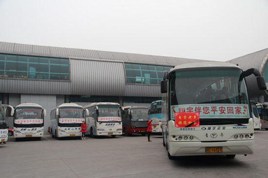 督促汽车客运站认真执行“三不进站、五不出站”管理规定,落实道路客运安全告知制度。汽车客运站加强了安检力量配备,杜绝超载和带“病”车辆出站上路,防止烟花、爆竹等危险品等进站上车,全面推行了《道路客运安全告知》视频的播放使用,驾驶员在乘客上车后发车前进行了标准规范的安全告知和安全驾驶承诺。在成都高新西区等在蓉外来务工人员较多的地方,尽管是采用包车形式,但现场的安全检查却一点也不含糊。在旅客装载之前,有工作人员专门对车辆的技术状况、驾驶员的资质证件进行审查,审查合格后装载旅客。车辆出站之前检查它的运行牌照是否齐全,提醒驾驶员注意行车安全,提醒旅客系好安全带,顺利返乡。现场工作人员还配备了手持式安检机,逐个对行李进行安全扫描。