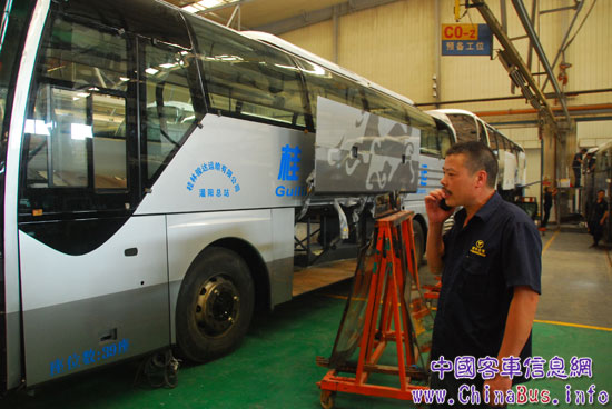 走进总装车间,“广西运德、桂林骏达运输有限公司……”生产线上停满了各地旅游公司订购的豪华旅游车以及月底即将交付北京、塔城的公交车。在一辆刚刚装上发动机的豪华大客车旁边,不停地打电话的是金华青年汽车制造有限公司副总经理陈尚宝,汗珠汇成了一道道的水流,川流不息地从他那坚毅而略带笑容的脸上挂下来,浸湿了他的工作服。他刚刚挂了电话,用他那双大手抹了一把脸上的“水流”,又一个电话打进来了,他尽量压低声音,显得温和一些,可汗流还是覆盖了他的眼睛、鼻子、嘴巴,于是他不得不又变得有些和外面的太阳一样,有点暴躁起来,“又要停吗?不是说好照顾我们的?!”他刚刚接到今天上午9点左右将要限电的通知,但是9点多将有一批客户前来考察。为了让客户尽可能直观地了解青年客车的生产工艺、流程,陈尚宝马上联系相关部门协调,要求先保证车间用电。