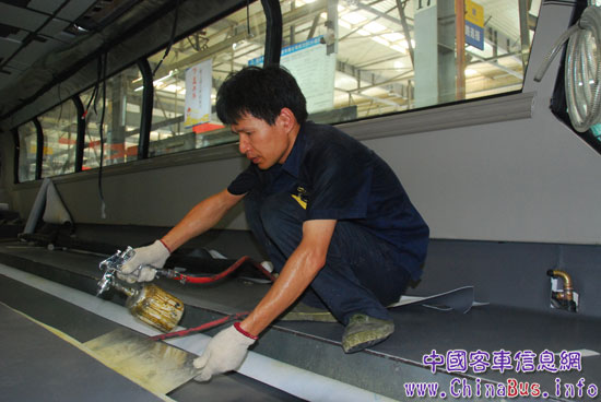 来自浙江衢州江山的毛在明今年40岁,他在青年客车已经工作7年了,是总装2号线一名普通的车内地板革粘接工人,几乎每天都是呆在车内工作。一走进车内,可以明显地感觉到温度较之车外又高了几度。毛在明蹲在车厢内,一手拿着胶枪,一手拿着铝板,仔细地在地板粘接面和地板革背面喷胶。毛在明说,他最近每天都是清晨四点多就过来上班,不仅是因为清晨温度低一点,完成生产任务心理踏实。我的想法只有一个,再闷再热,也要保质保量完成生产任务。