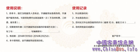 见招拆招!其实,在制定春运服务作战计划时,宇通售后服务部门的相关人员就考虑到了如何应对突发情况。他们向每辆做完安全检查的客车发放一张“春运急修直通卡”:在2014年1月16日至2月25日期间,无论何时何地,只要宇通用户车辆出现故障,凭借此卡就可以享受免费外出救急一次。这一“奇”招重在“快、准、狠”,讲究在第一时间迅速帮助用户解决车辆故障。