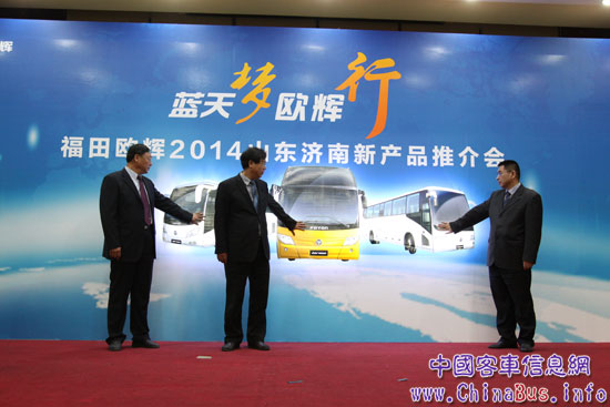 作为2014年福田欧辉城间新品首场推介会,福田汽车集团副总裁、欧辉客车事业部总经理解佃峰先生,福田汽车集团客车市场总监、欧辉客车事业部副总经理邱林文先生和山东交通学院检测中心主任王庆东先生三位领导共同发布了福田欧辉BJ6129双风挡、BJ6113、BJ6902三款城间客车新产品,将推介会现场带入了高潮。