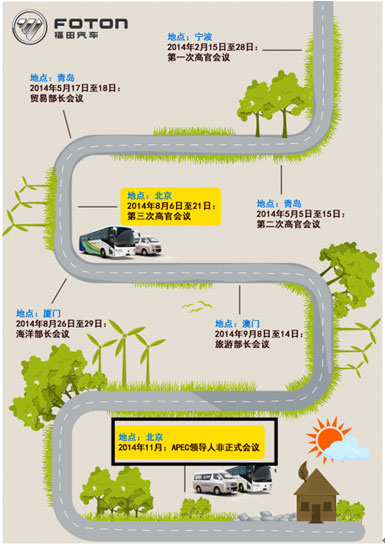在2014年11月北京怀柔将举办的领导人非正式会议,福田汽车将继续作为保障用车全程服务APEC会议。福田汽车APEC专属服务团队随时待命,全力确保APEC会议的顺利进行。