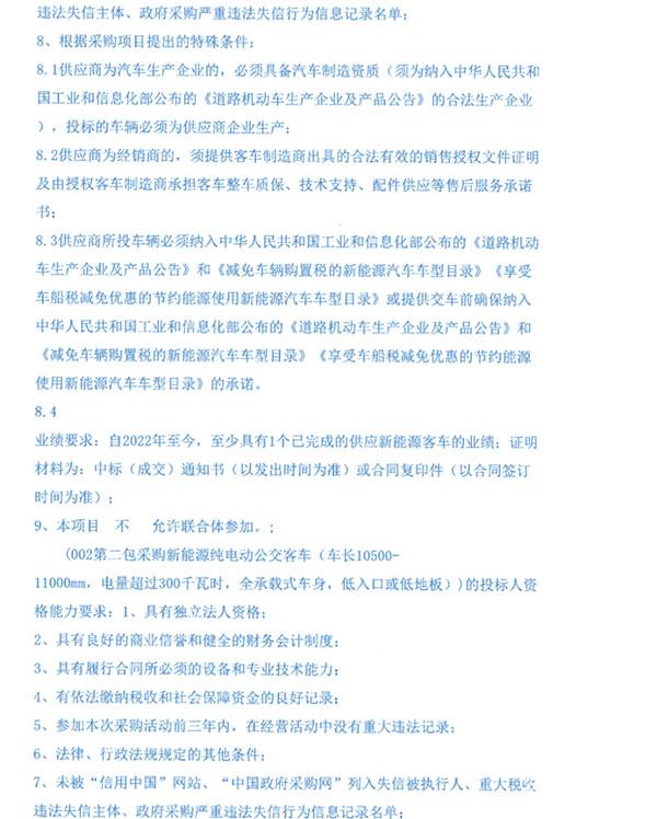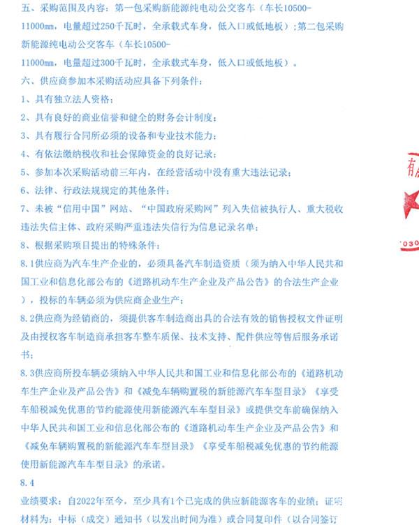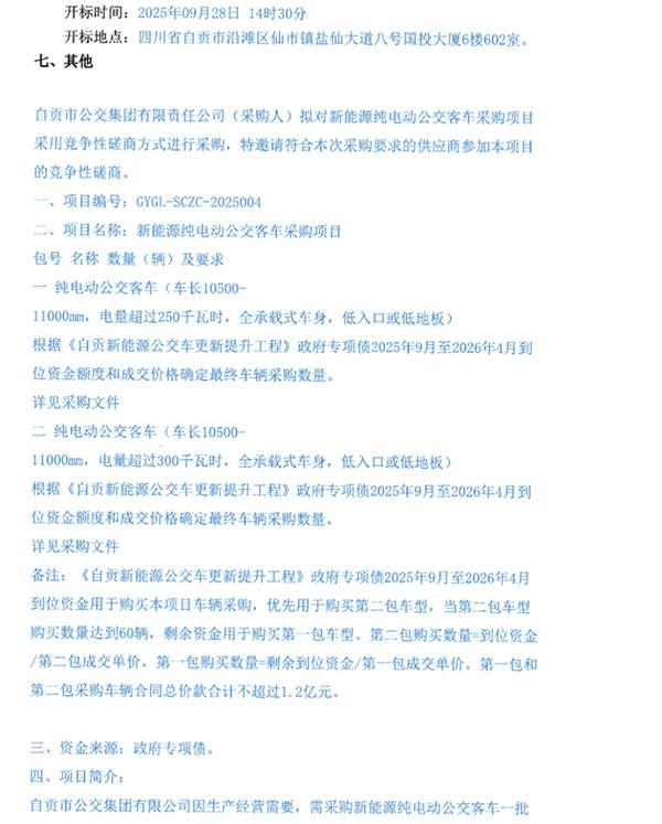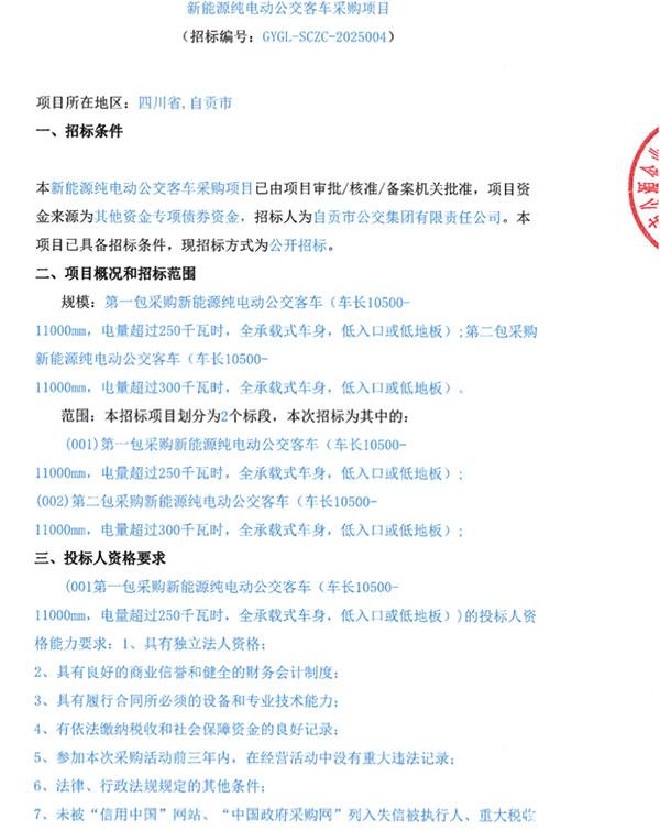 该项目分为2个标段,其中第一包采购纯电动公交车(车长10500-11000mm,电量超过250千瓦时,全承载式车身,低入口或低地板);第二包采购纯电动公交车(车长10500-11000mm,电量超过300千瓦时,全承载式车身,低入口或低地板)。根据《自贡新能源公交车更新提升工程》政府专项债2025年9月至2026年4月到位资金额度和成交价格确定最终车辆采购数量。第一包和第二包采购车辆合同总价款合计不超过1.2亿元。