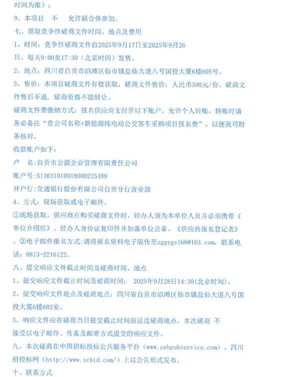 近日,四川省自贡市公交集团有限责任公司发布新能源纯电动公交客车采购项目(招标编号:GYGL-SCZC-2025004)的延期公告(补遗02号),明确将竞争性磋商文件发售时间从2025年9月17日09:00至9月26日17:30延期至2025年9月30日18:00,磋商保证金缴纳截止时间同步顺延至2025年9月30日18:00,提交响应文件截止时间及磋商时间由2025年9月28日14:30调整为2025年10月9日14:30,其余内容保持不变,旨在为潜在投标人预留更充足准备周期,保障招标工作有序推进。