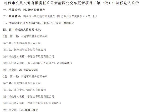 2025年10月20日,黑龙江省鸡西市公共交通有限责任公司新能源公交车更新项目(第一批)中标候选人公示发布。该项目共划分3个标包,共采购125辆新能源公交车。其中,1包 50 辆,预中标候选人为中通客车股份有限公司;2 包36辆,预中标候选人为宇通客车股份有限公司;3 包39辆,预中标候选人为沈阳中车电动汽车有限公司。公告期限为2025年10月20日到2025年10月23日。