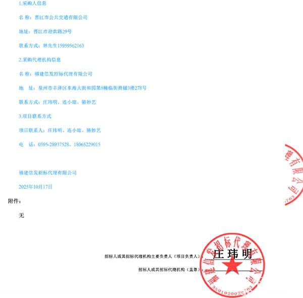 2025年10月17日,福建信发招标代理有限公司发布了晋江公交118辆新能源公交车采购项目结果公告。厦门金龙旅行车有限公司、厦门金龙联合汽车工业有限公司成功包揽四个合同包,总中标金额为9959.53万元。